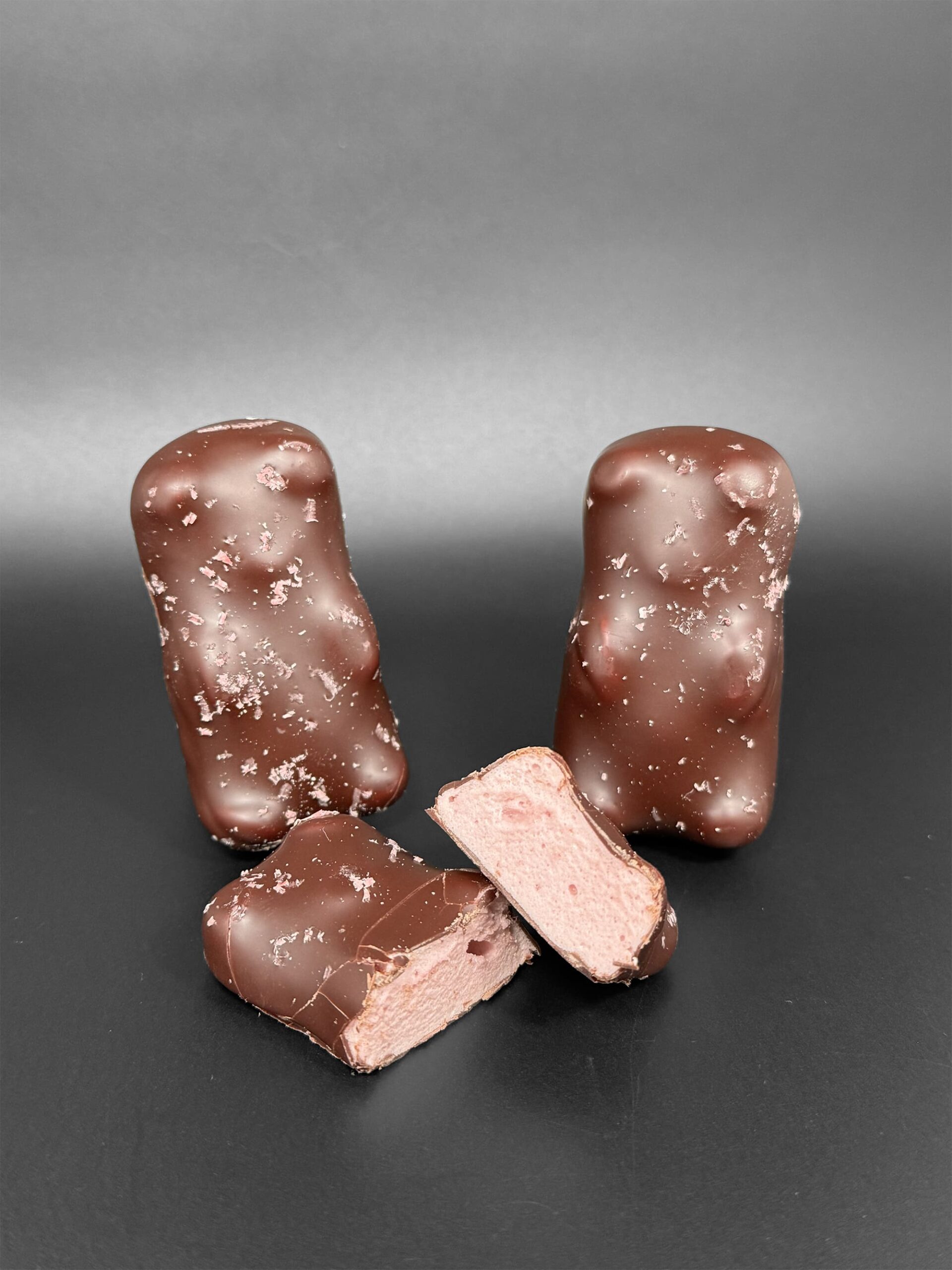 Oursons en guimauve à la pulpe de framboise enrobés de chocolat noir