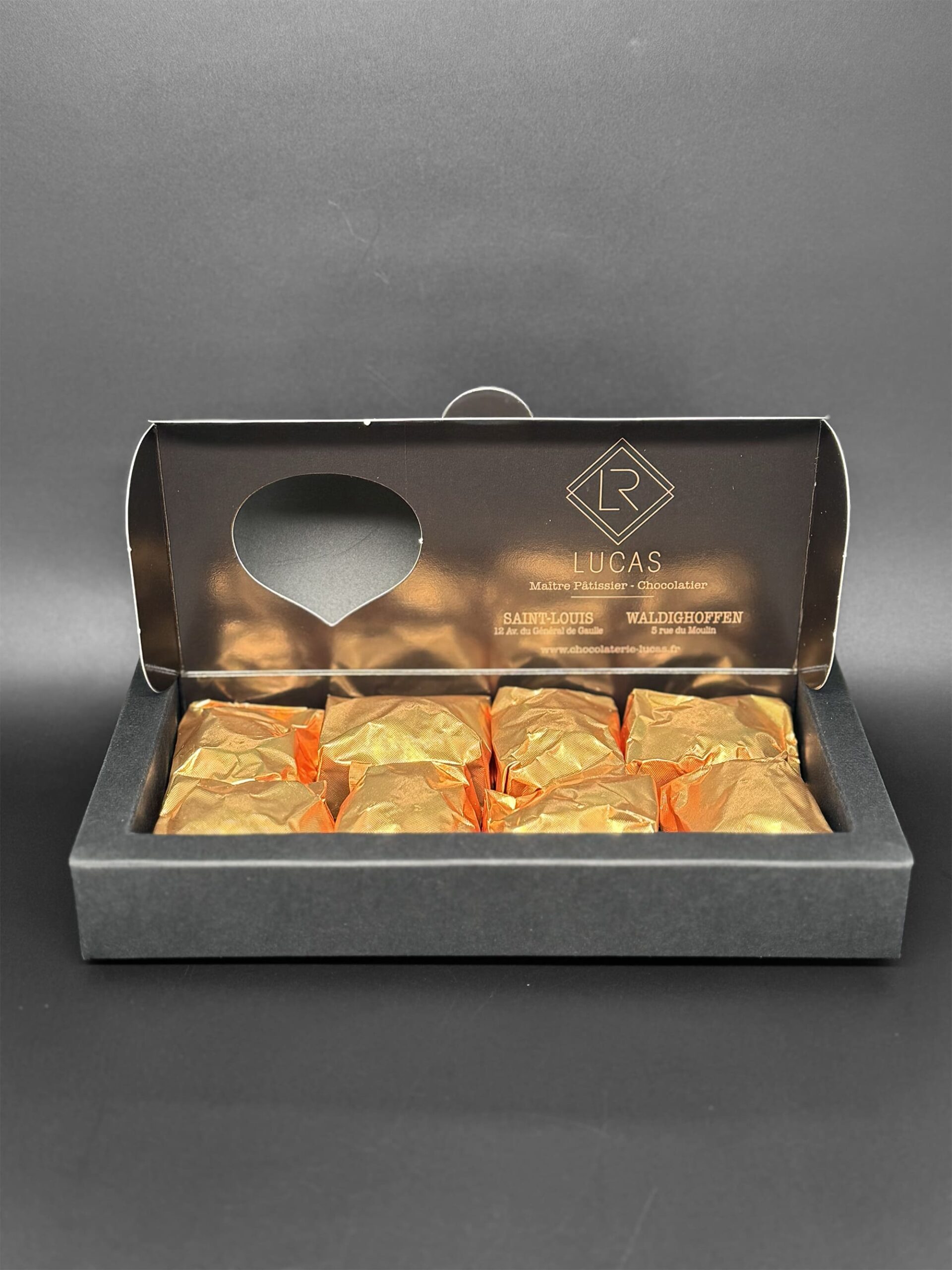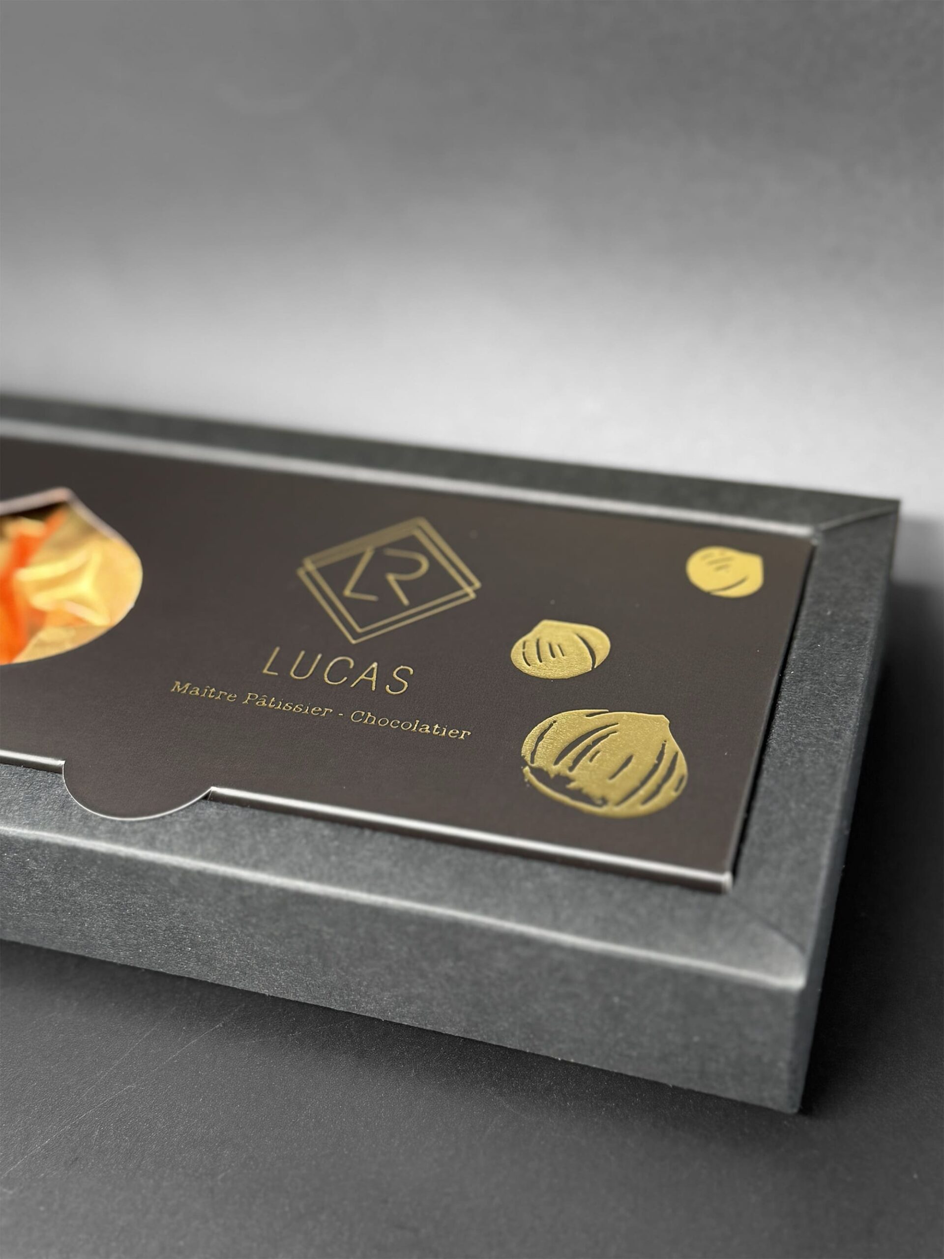 Ici, pas de grandes déclarations ni de secrets bien gardés : juste huit marrons glacés, prêts à fondre sous la dent. Chez Lucas, on préfère laisser la gourmandise parler d’elle-même. Sans gluten, sans lactose, sans gélatine, ces marrons jouent la carte de la simplicité, mais savent surprendre. Croquez, savourez, recommencez… et laissez-vous embarquer, le temps d’une bouchée, dans l’atelier d’un chocolatier qui aime autant s’amuser qu’émoustiller les papilles.