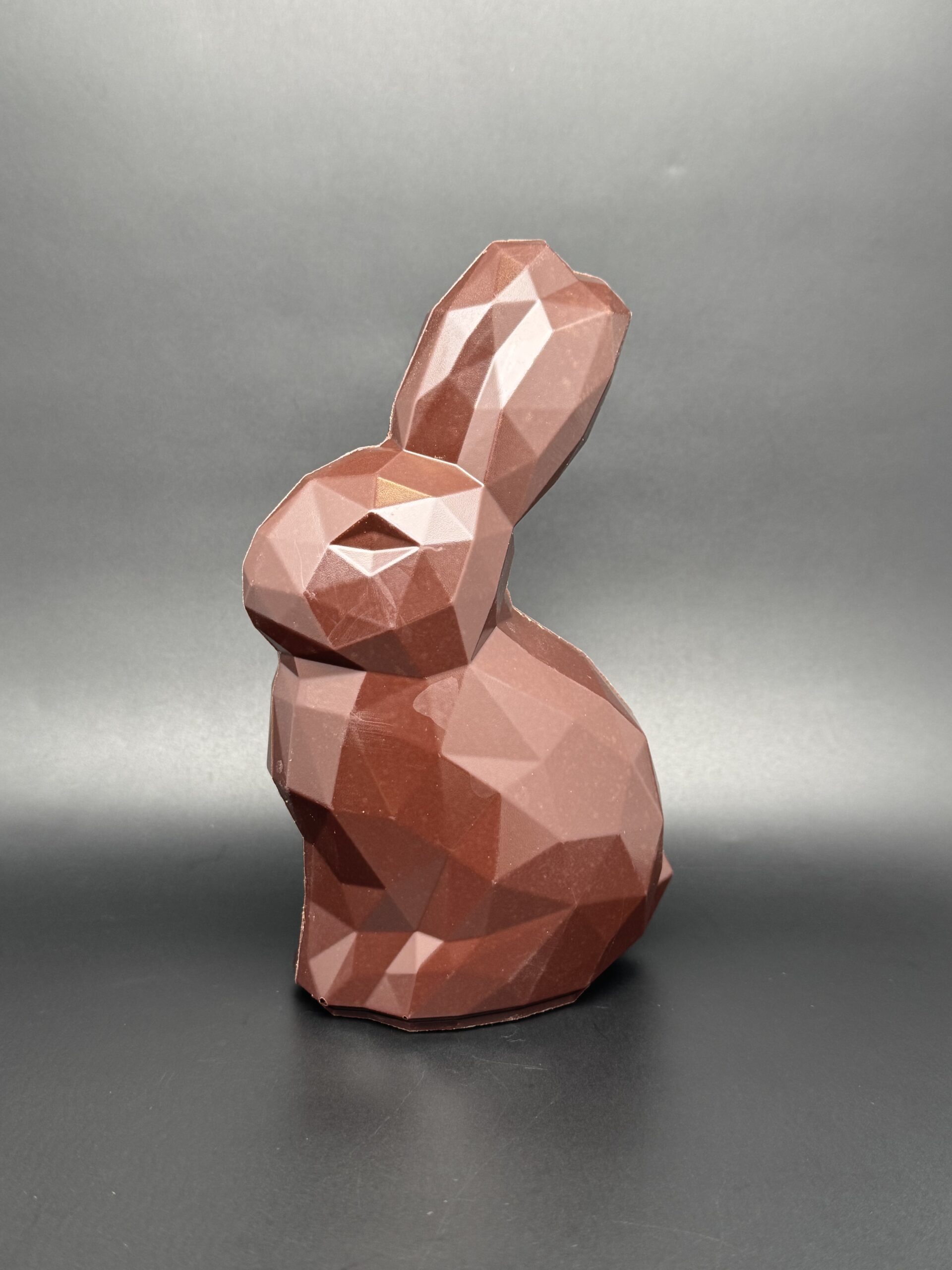 Moulage « Grand Lapin Origami » en chocolat blanc, dulcey, au lait ou noir.
