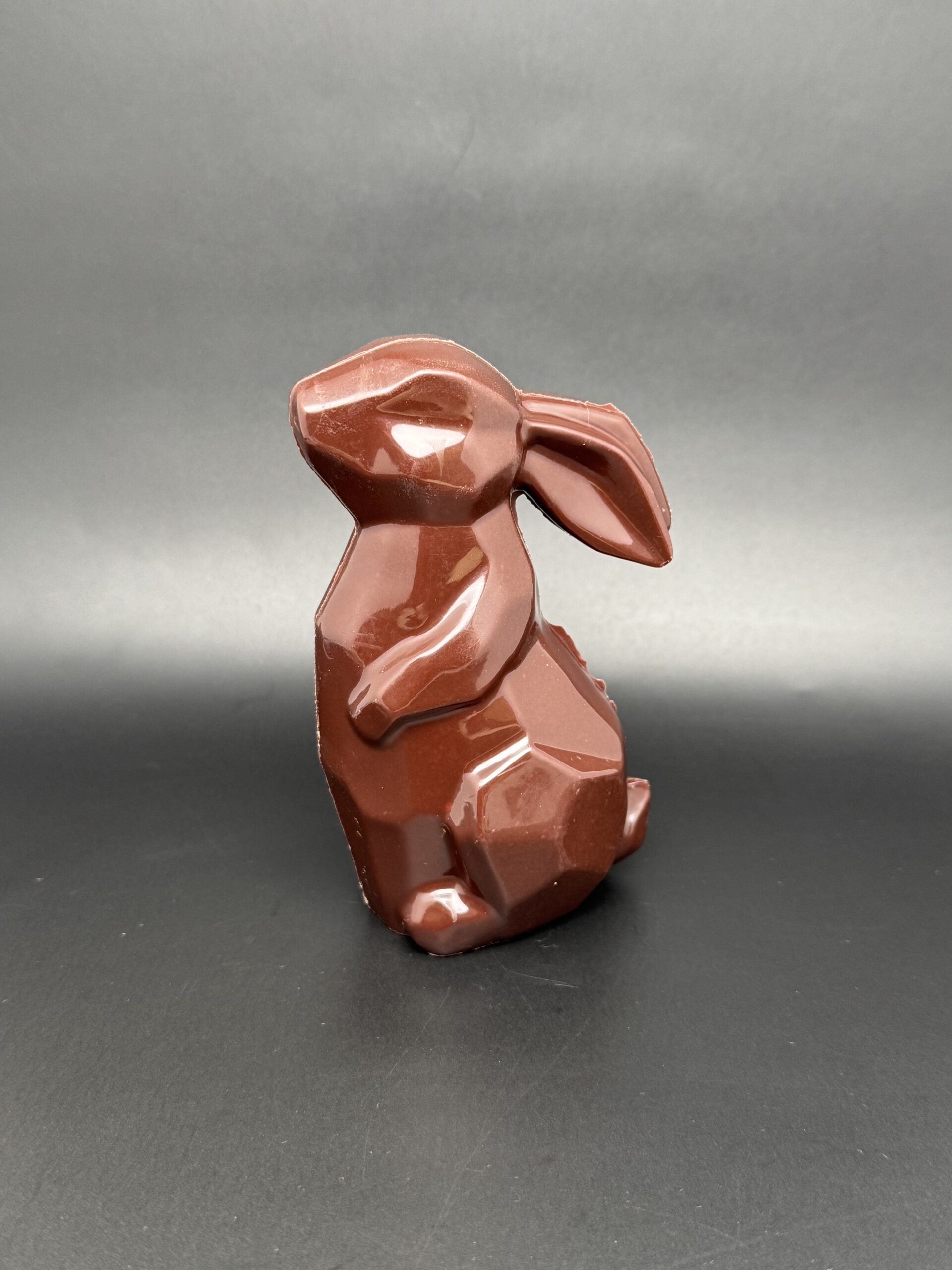 Moulage "Lapin Rocher" en chocolat au lait ou chocolat noir.