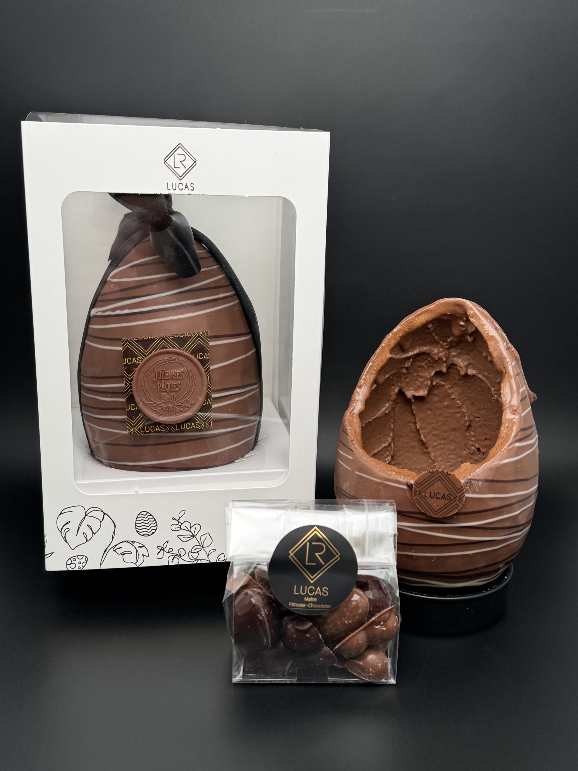 Un œuf en chocolat généreux, dont l’intérieur est recouvert d’une couche de praliné noisette, apportant gourmandise et intensité à chaque bouchée. À l’intérieur, un assortiment de petits œufs fourrés et de fritures en chocolat vient compléter cette création. Disponible en petit et grand modèle, en chocolat au lait ou en chocolat noir, pour une dégustation riche et réconfortante.