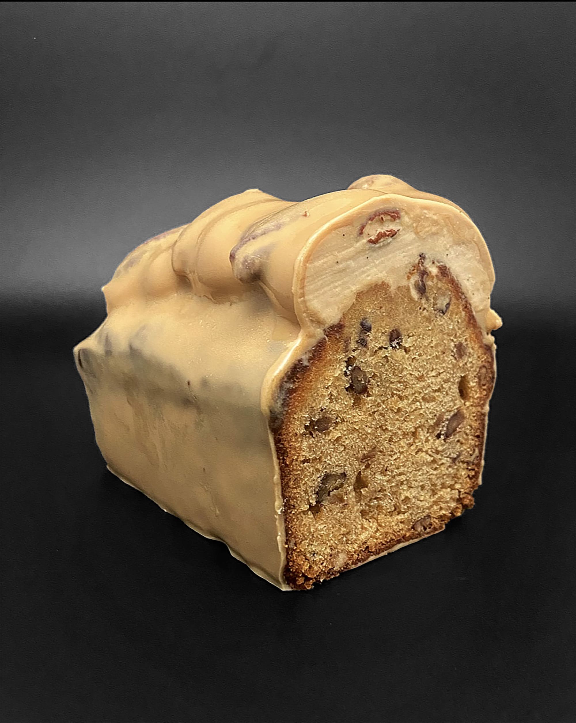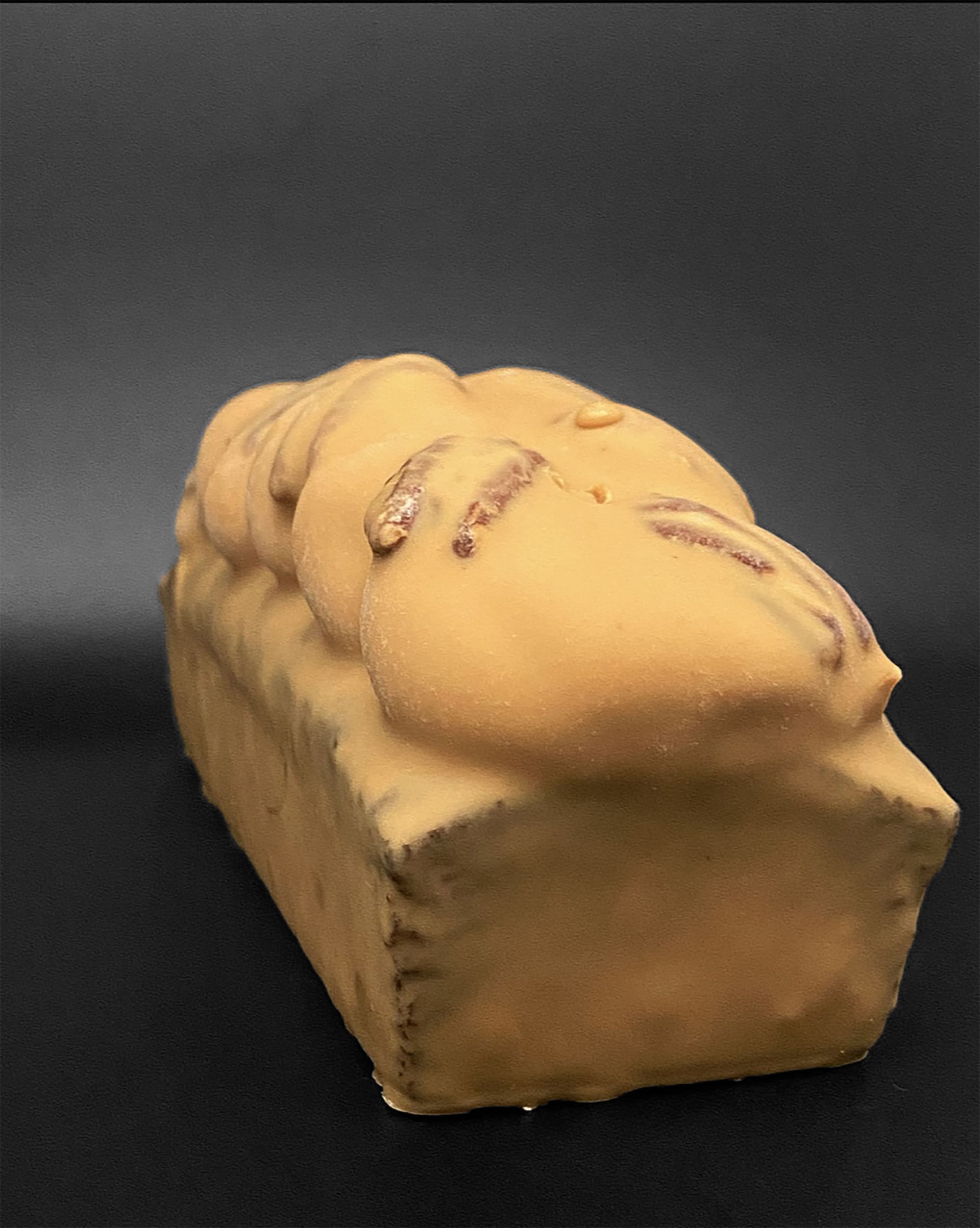Cake caramel et noix de pécan torréfiées, crème mousseuse de caramel, le tout enrobé de chocolat blanc caramélisé.