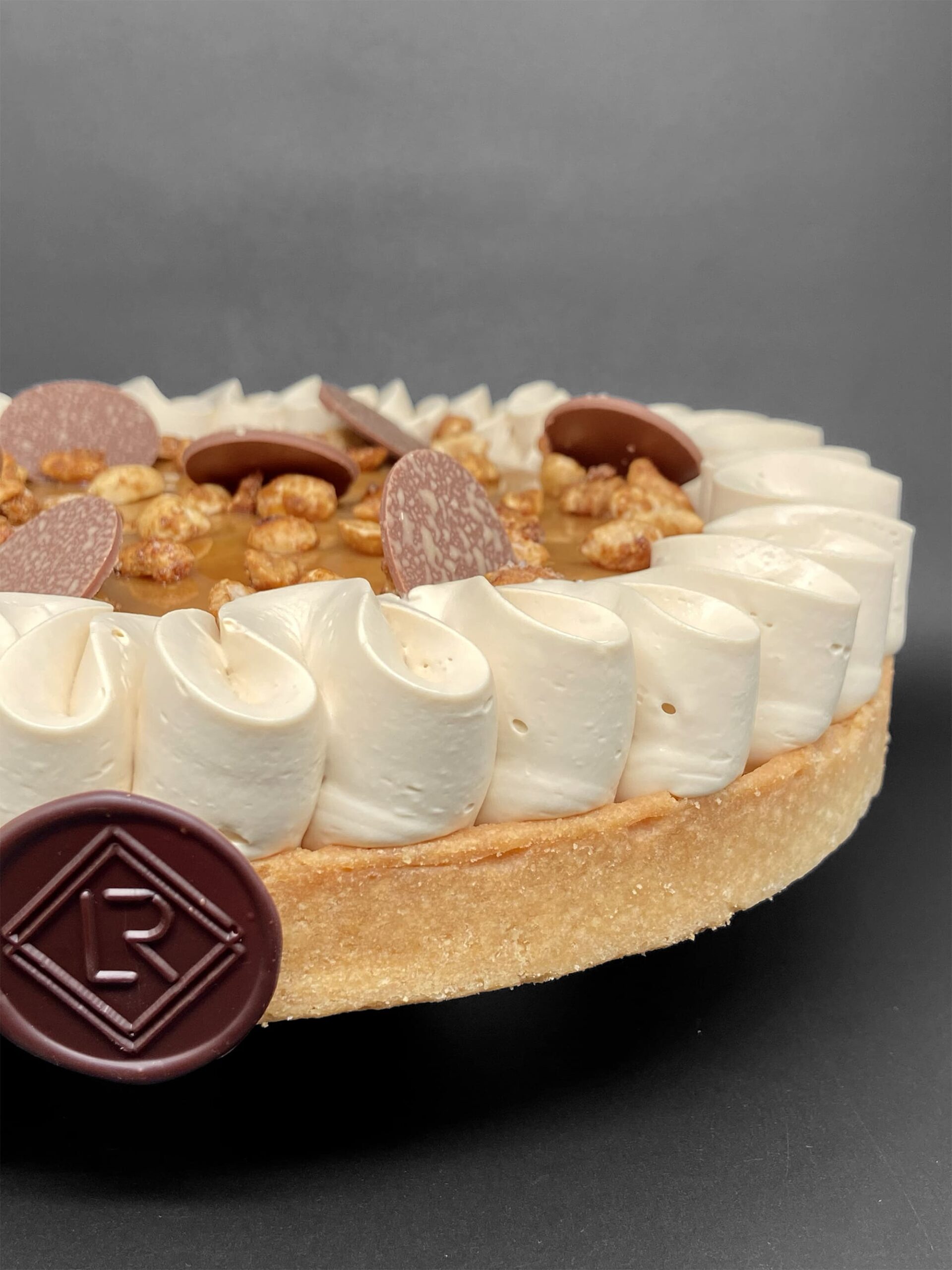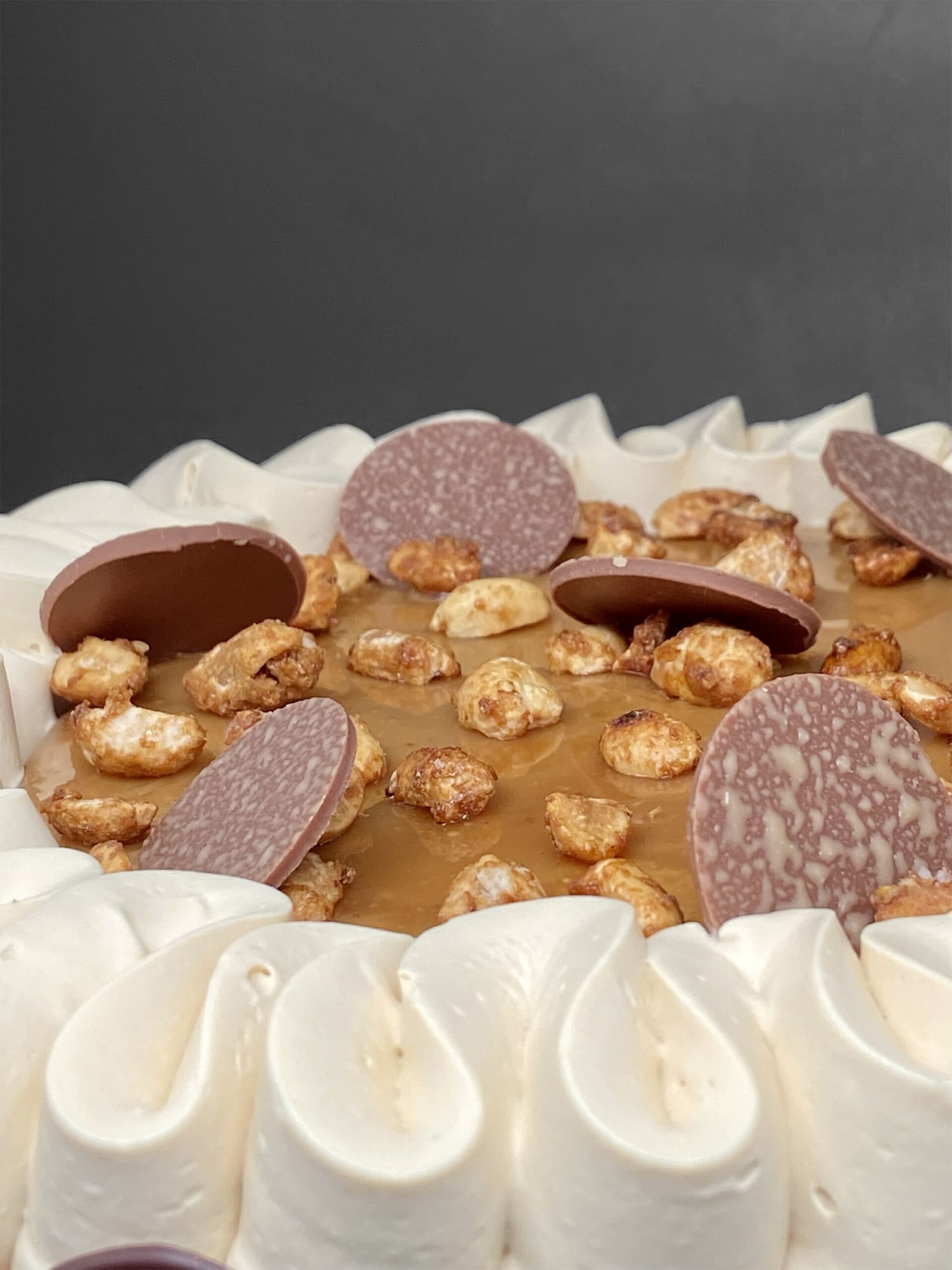 Pâte sablée Crémeux caramel Crémeux praliné cacahuète et cacahuètes caramélisées Biscuit moelleux et chantilly biscuitée