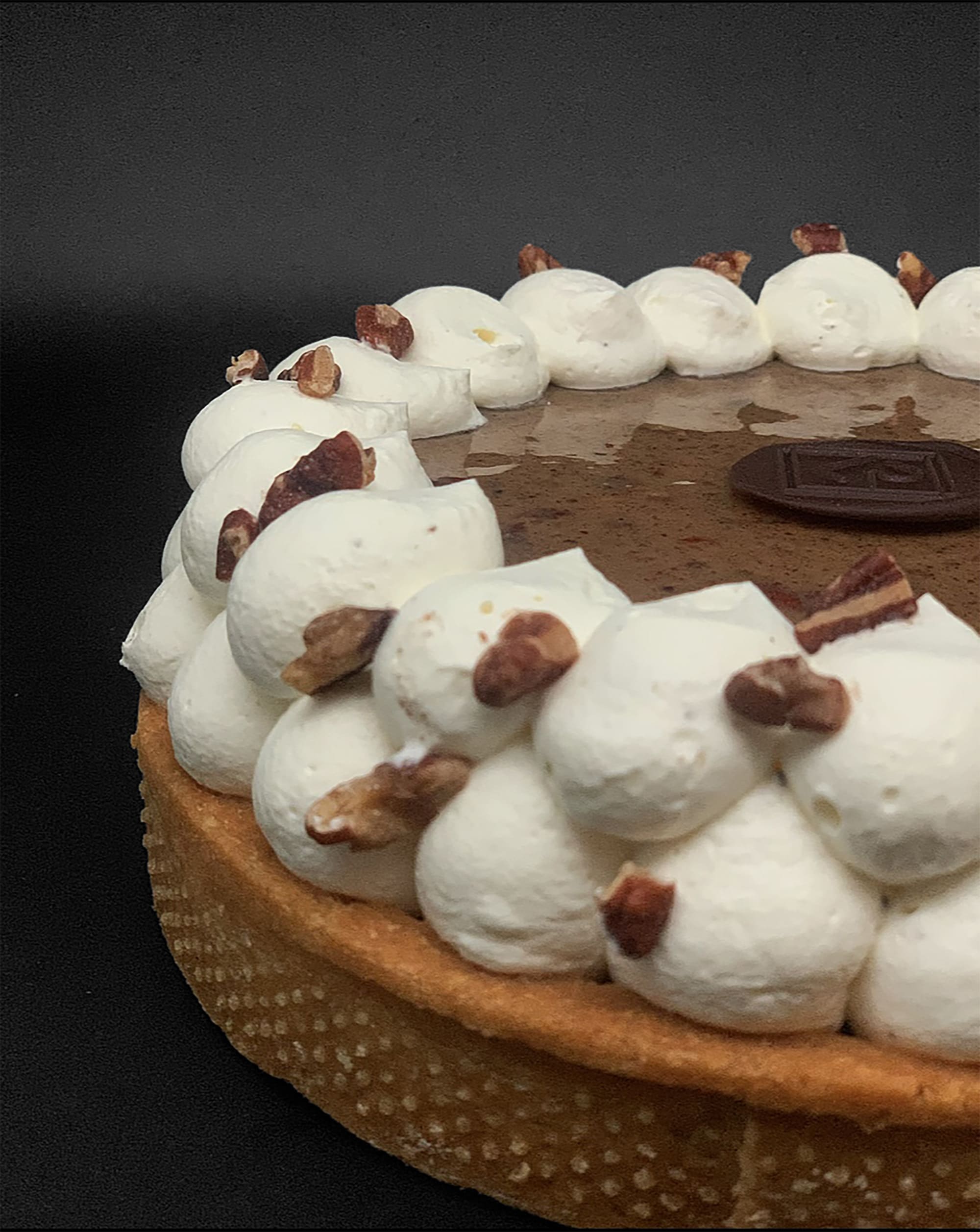 Crème d'amande sur une pâte sablée aux amandes Crémeux tendre à la noix de pécan & noix de pécan grillées Filet de caramel tendre Chantilly onctueuse à la vanille