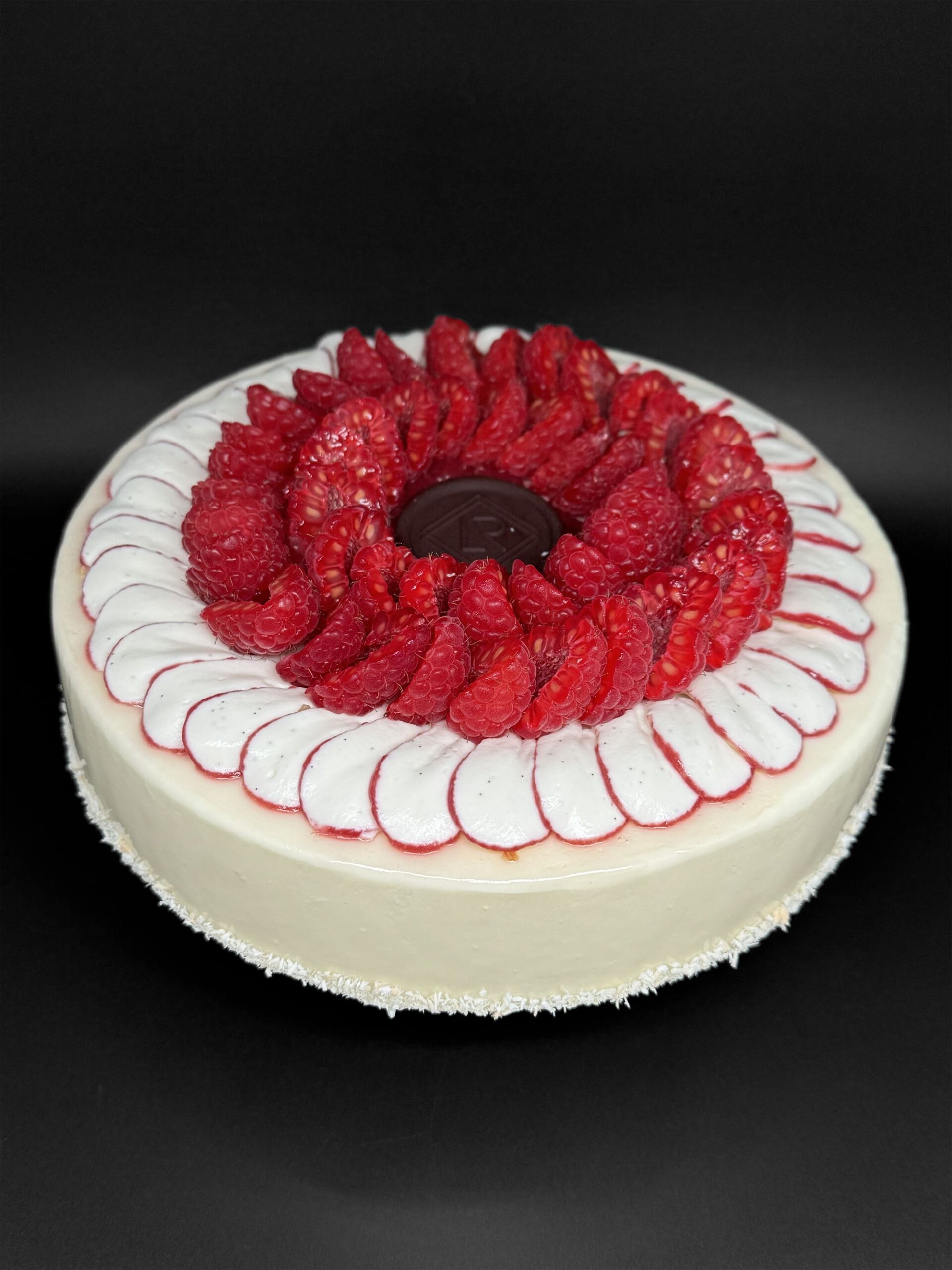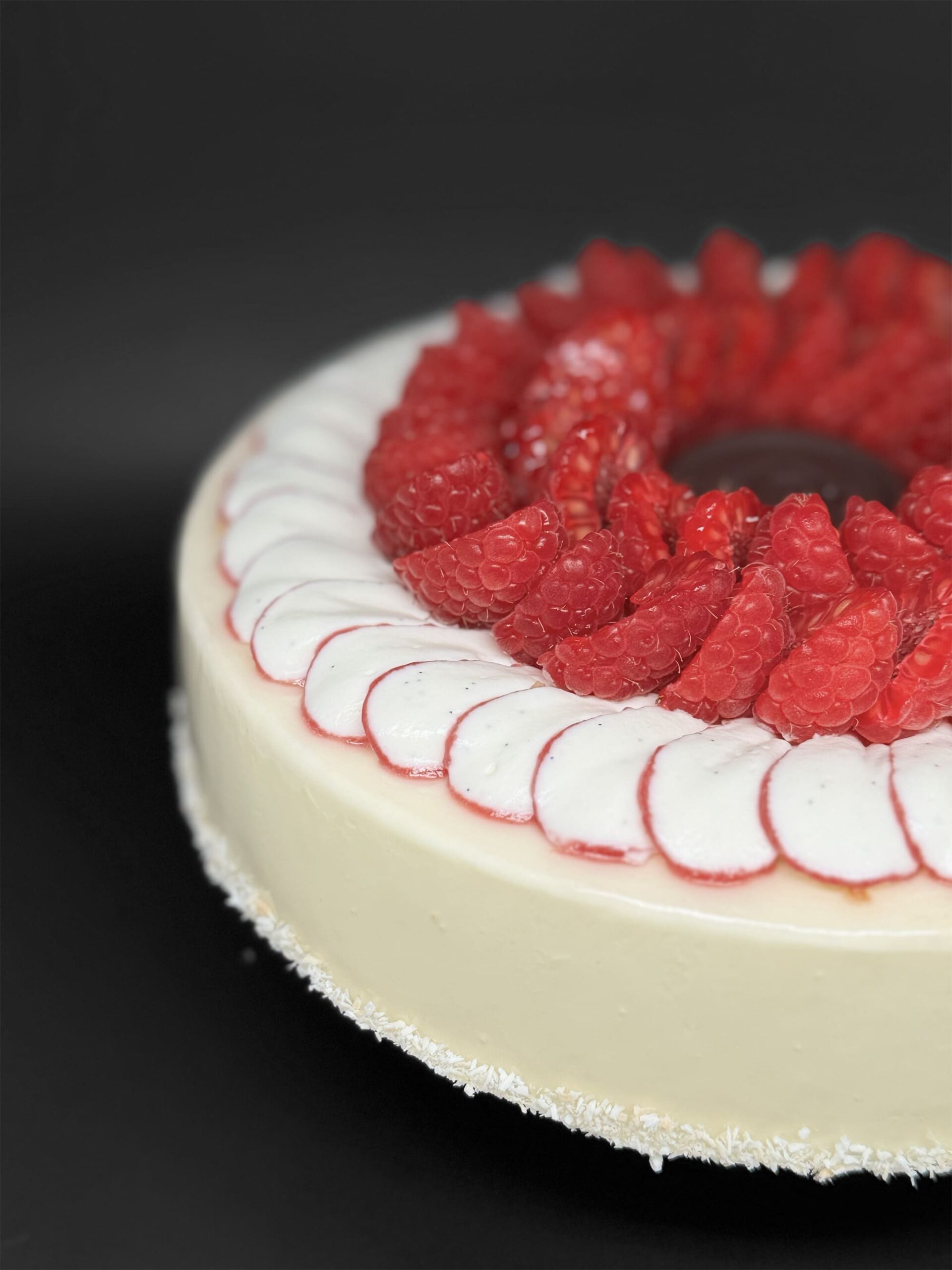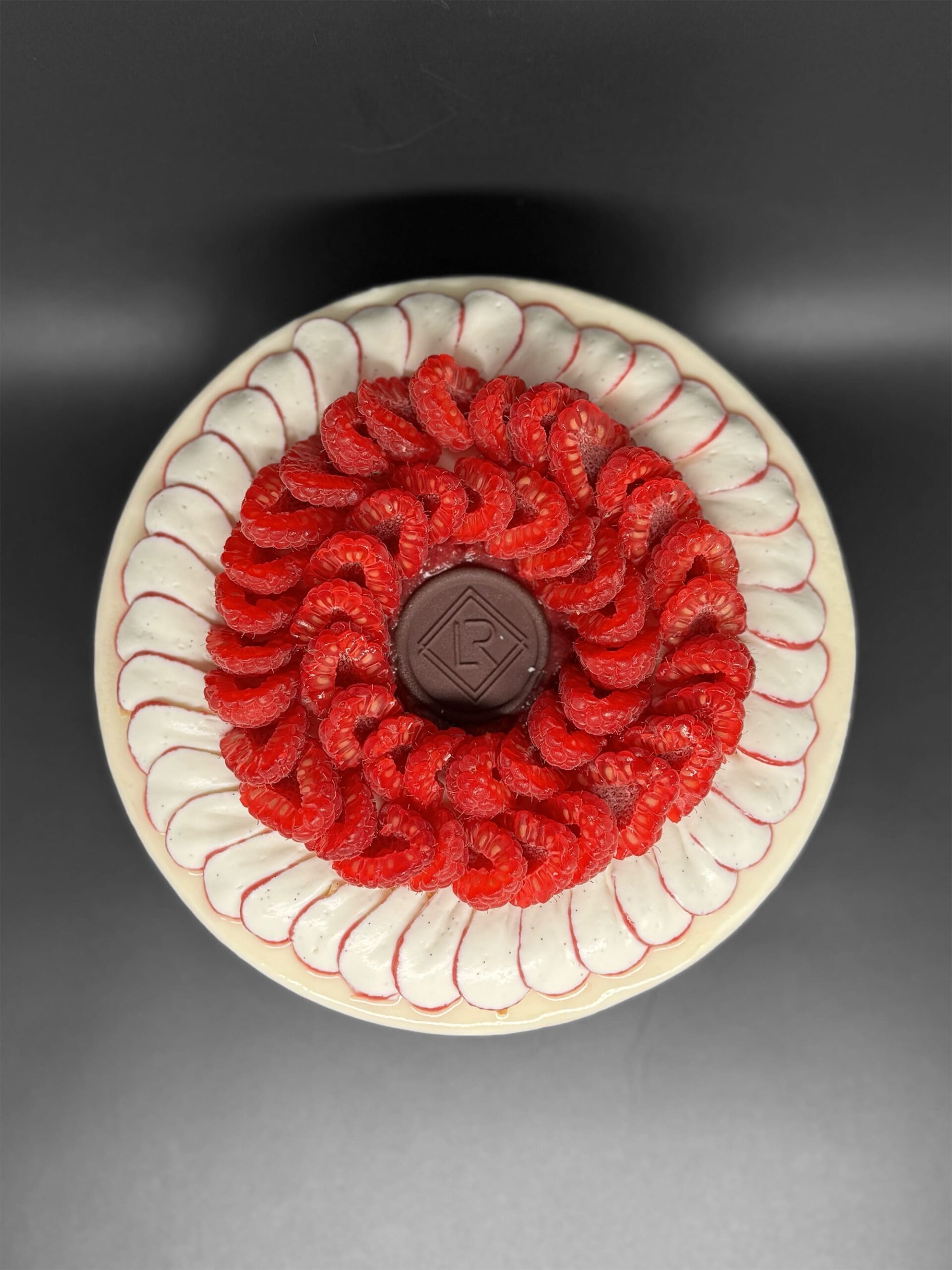 Mousse noix de coco Compotée de framboise Crémeux noix de coco Biscuit chocolat et croustillant