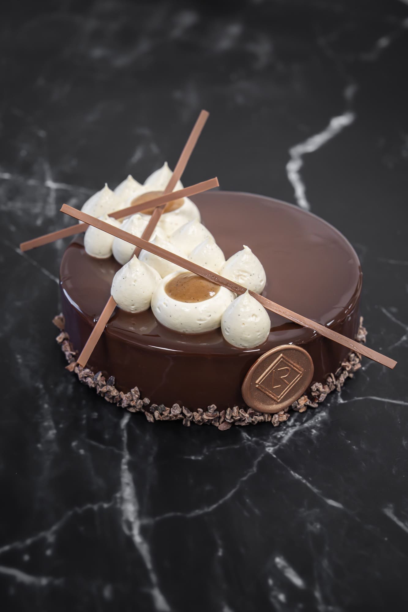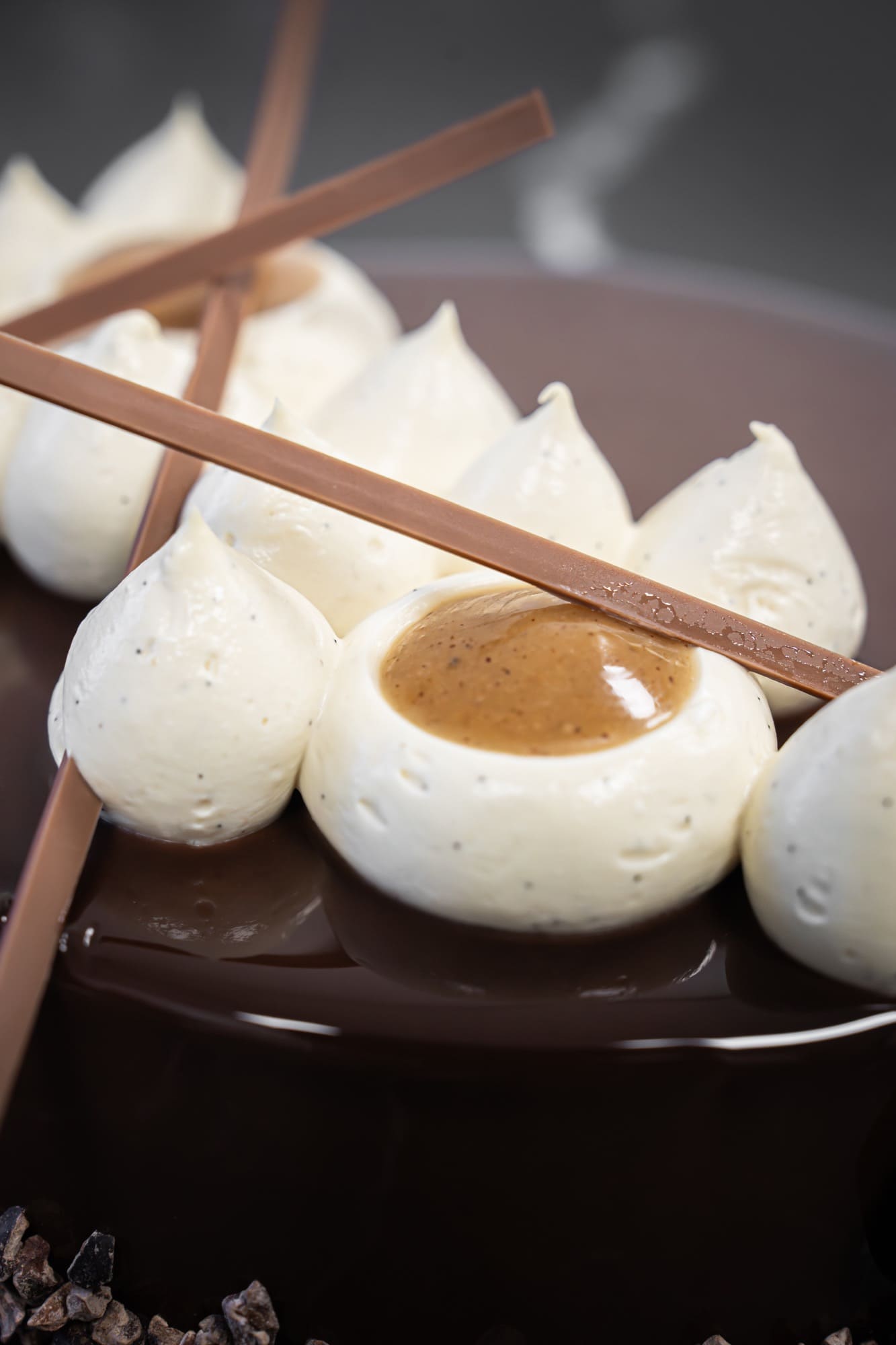 Pour quatre gourmands, Lucas a imaginé un entremets qui ne se prend pas trop au sérieux, mais qui sait parfaitement où il va : droit au bonheur. Entre un chocolat intense qui met tout le monde d’accord, un praliné du Piémont qui joue les trouble-fête, et un craquant noisette qui finit de convaincre les sceptiques, impossible de résister. C’est simple, chaque bouchée donne envie d’oublier les bonnes manières et de plonger la cuillère sans attendre.