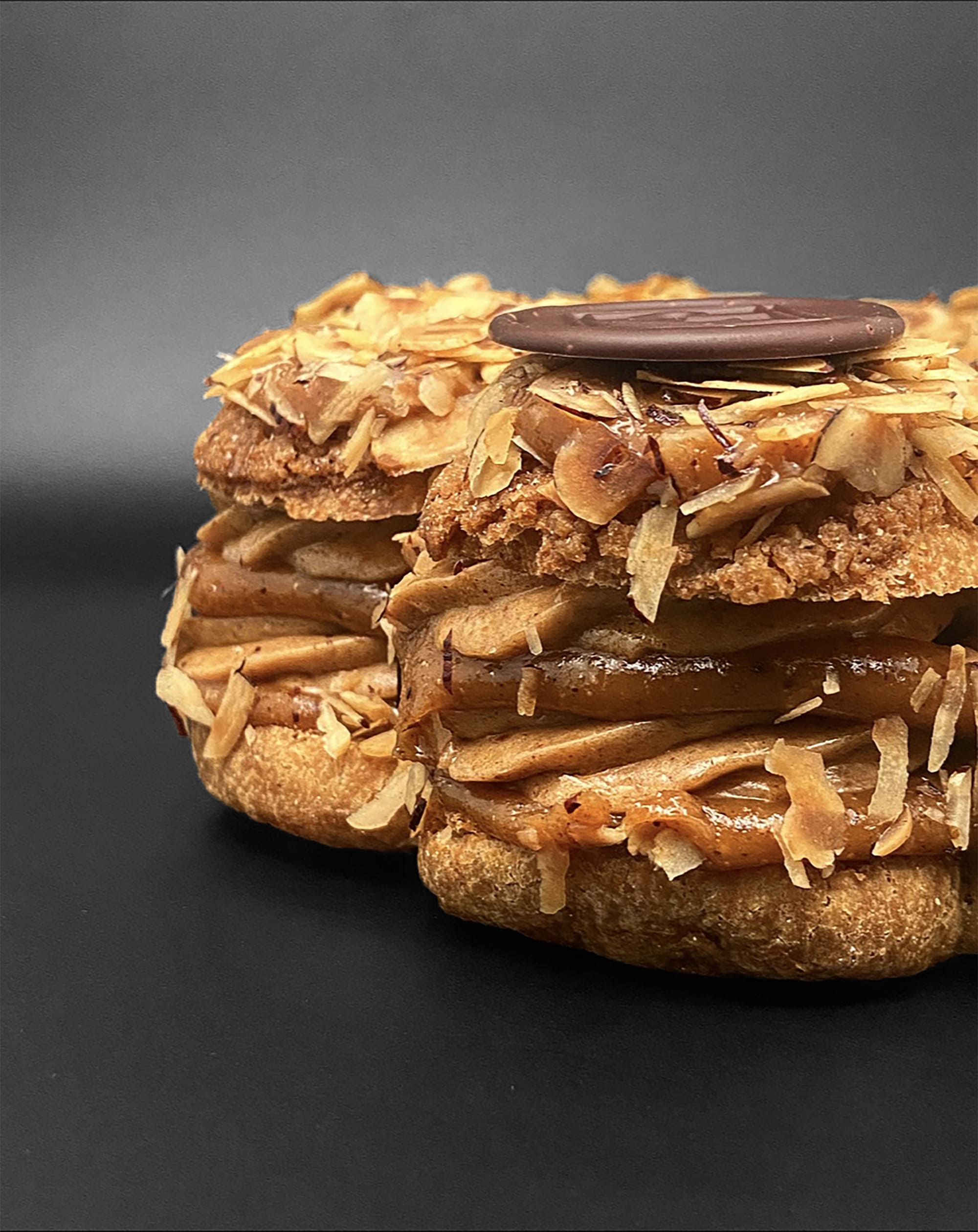 Mousse praliné noisette Crémeux onctueux à la noisette Praliné coulant Pâte à choux et noisettes effilées torréfiées