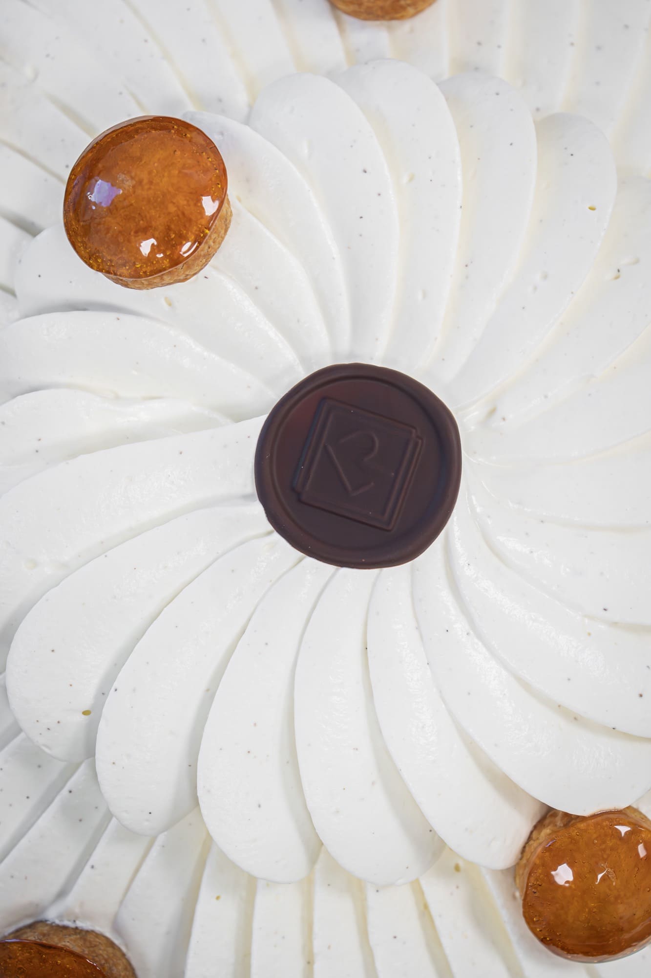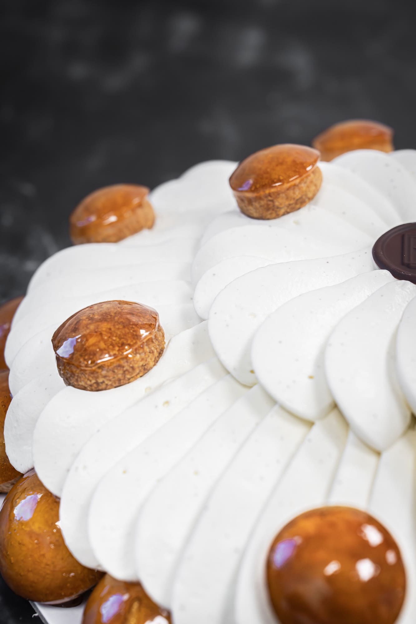Fond de pâte feuilletée Choux vanille caramélisés Filet de caramel onctueux Crème diplomate et crème chantilly vanille