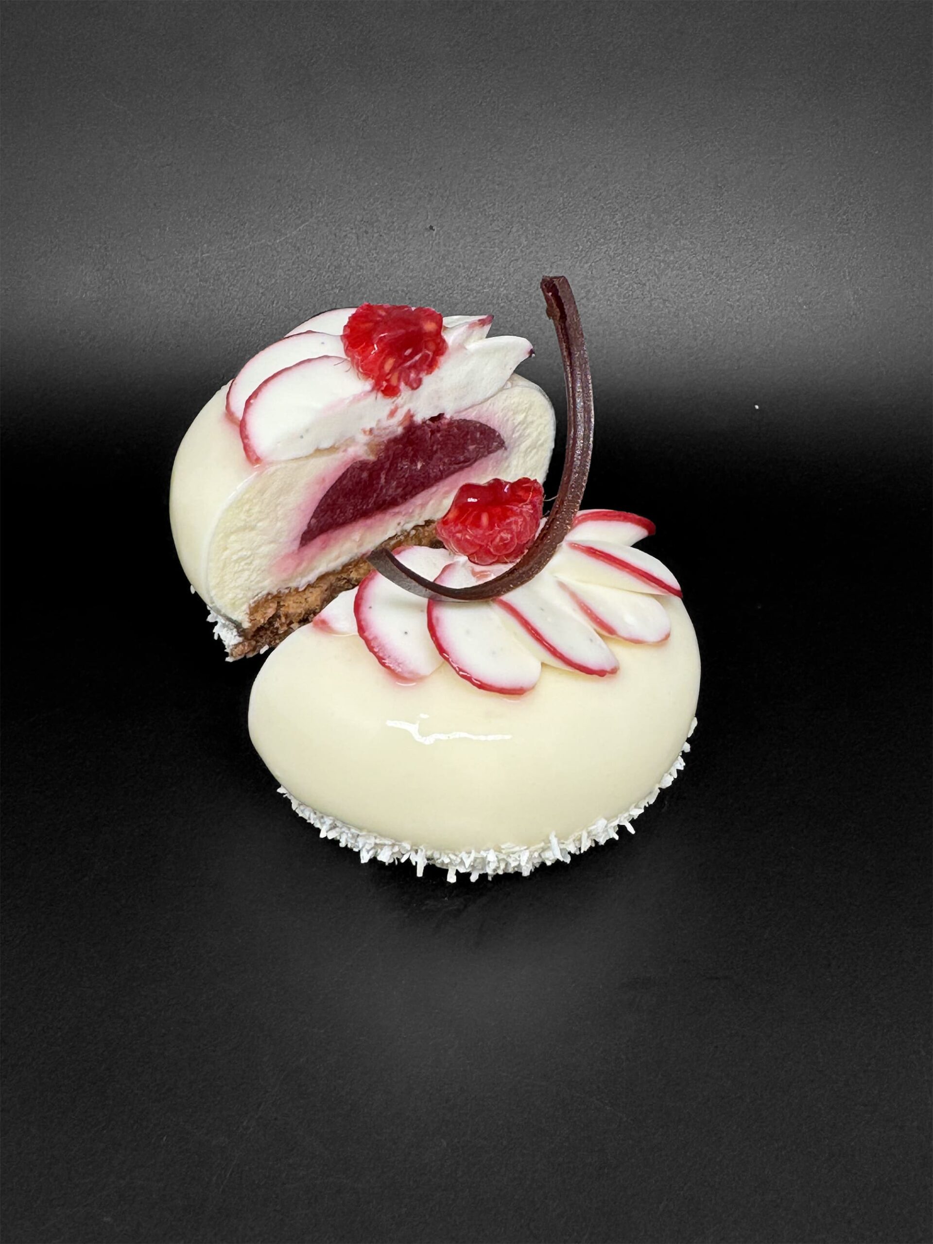 Mousse noix de coco Compotée de framboise Crémeux noix de coco Biscuit chocolat et croustillant