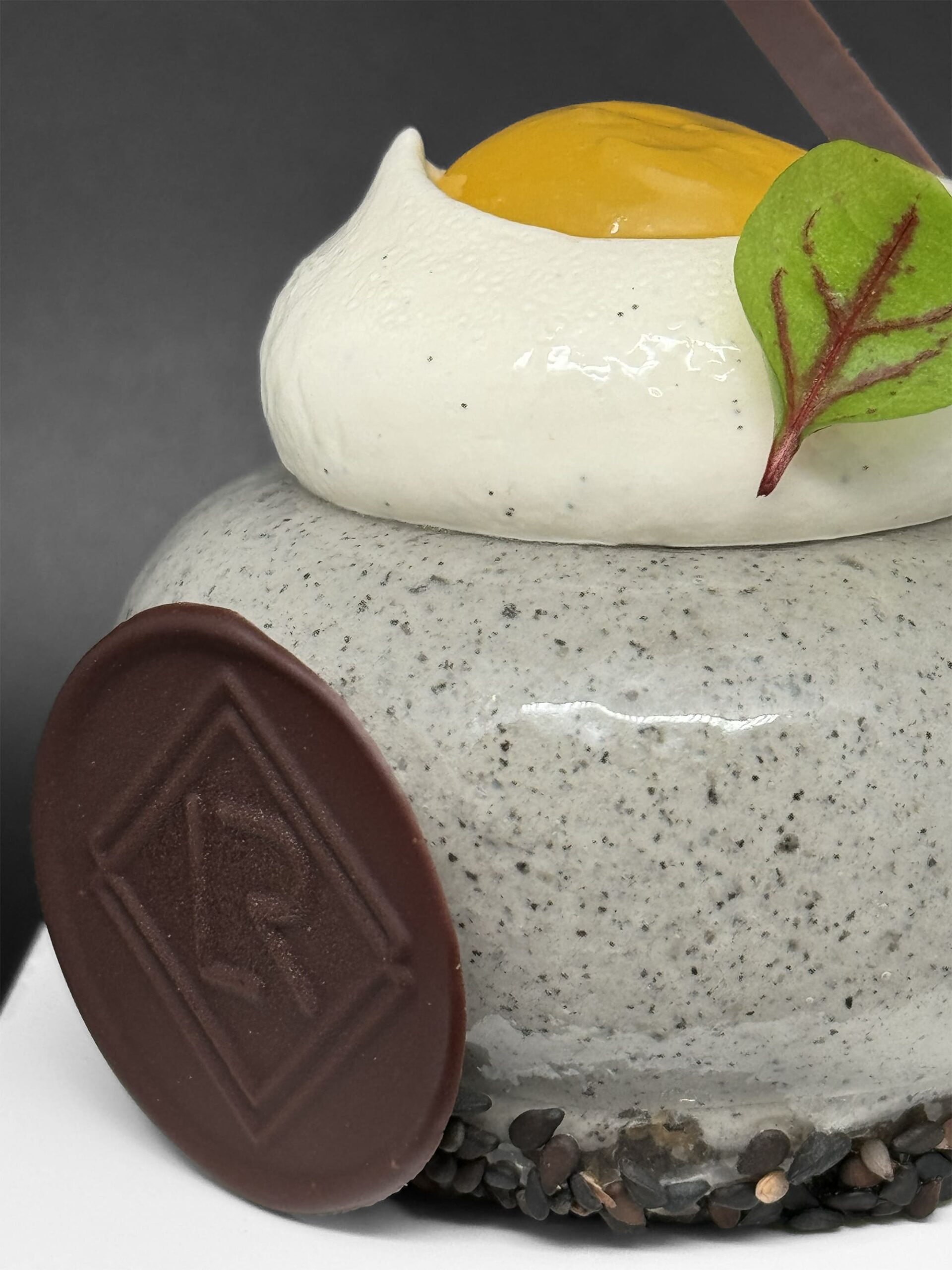 Pain de Gênes au sésame Croustillant amande & sésame noir Crémeux yuzu/mandarine Mousse au sésame noire
