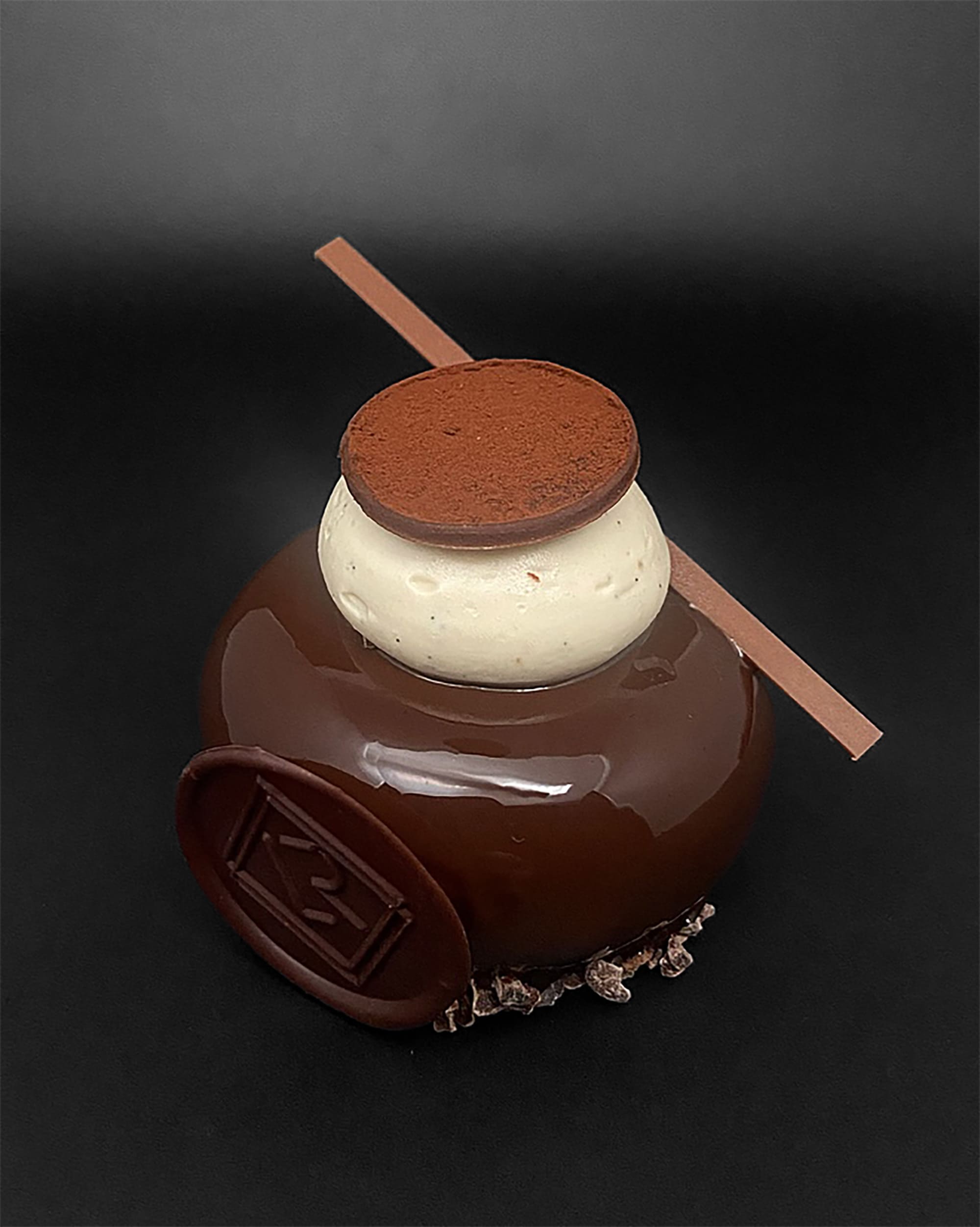 Mousse au chocolat 66% Crémeux tendre au praliné 66% (Noisettes Piémont IGP) Fond croquant aux noisettes et crêpes dentelles Biscuit "joconde" aux noisettes