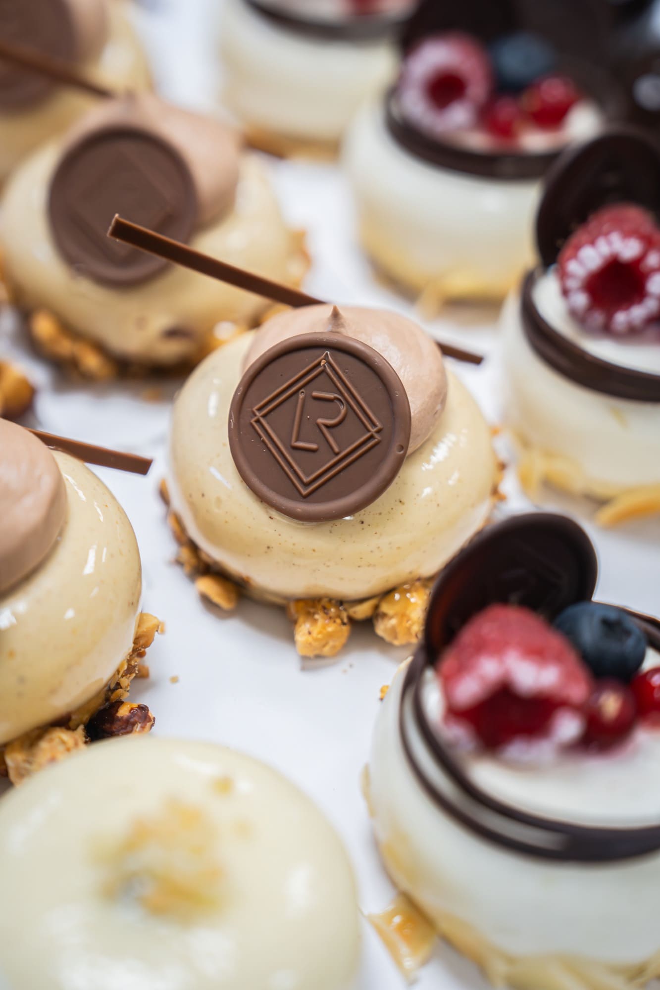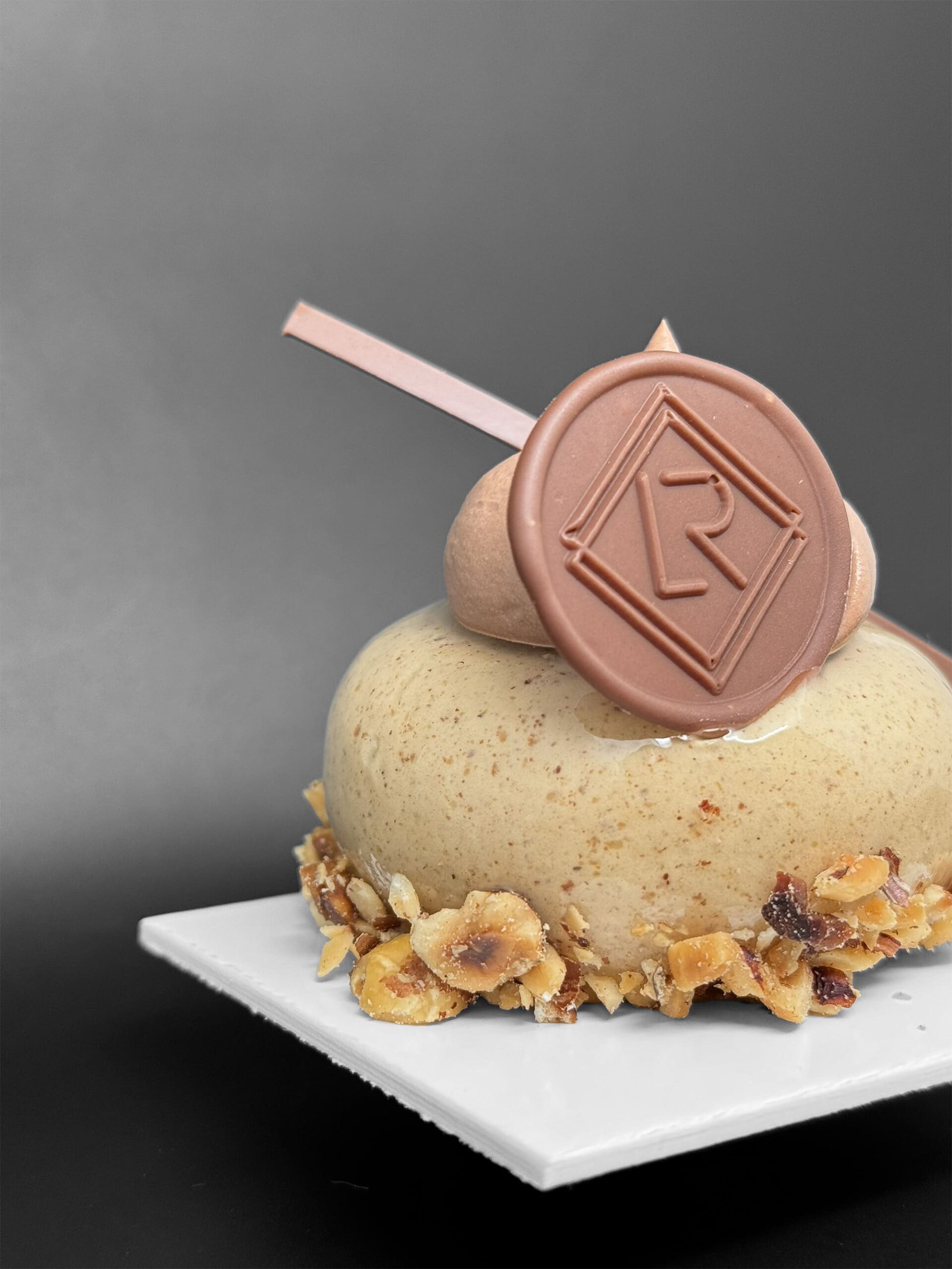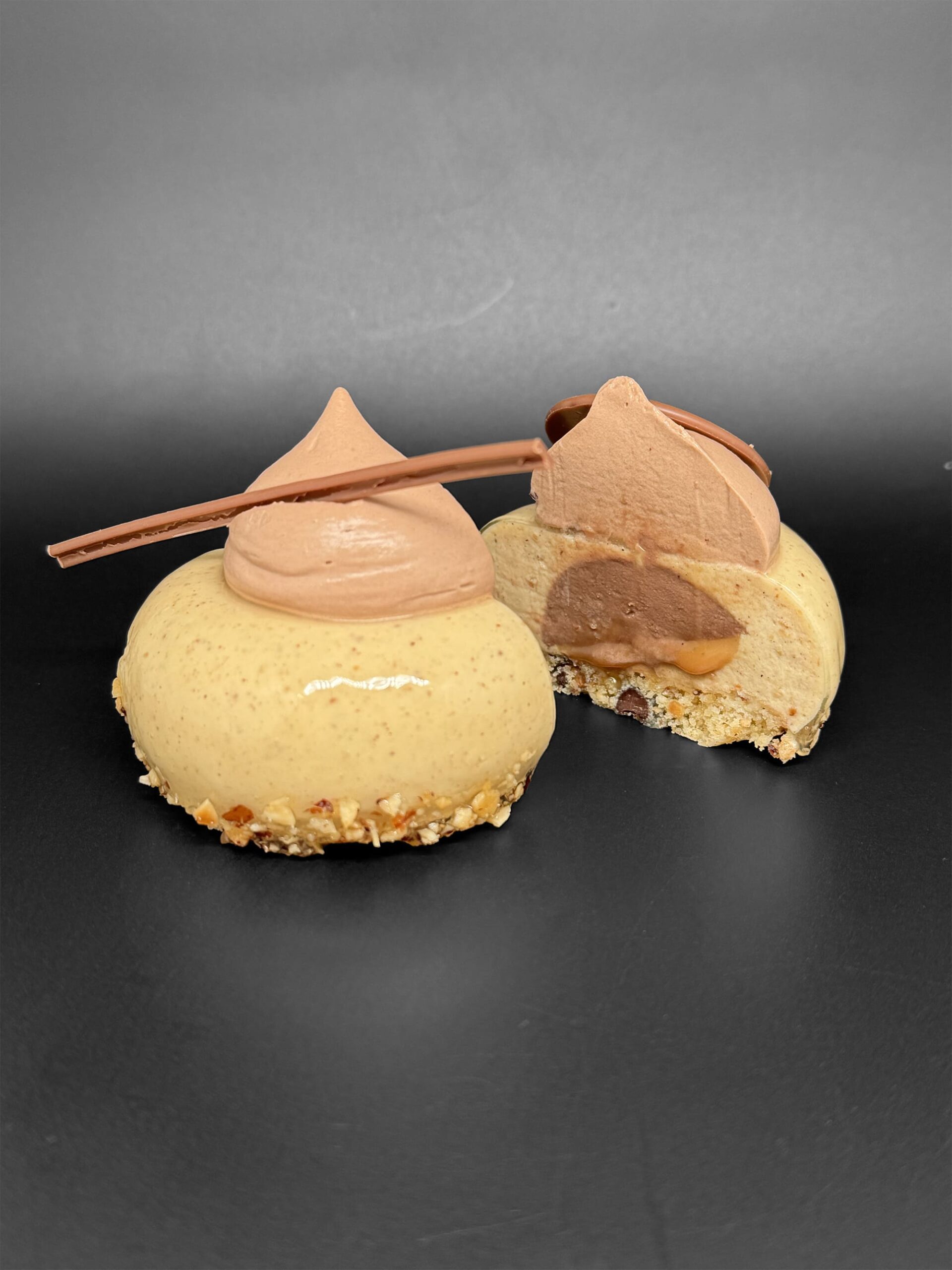 Mousse à la noisette du Piémont IGP Crémeux au chocolat au lait 39% & chocolat noir 66% Biscuit et croustillant à la noisette Ganache montée au chocolat
