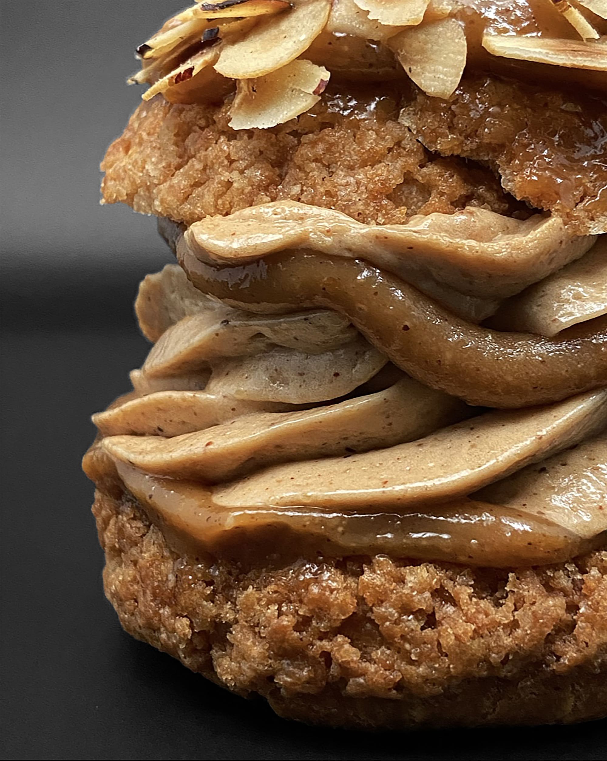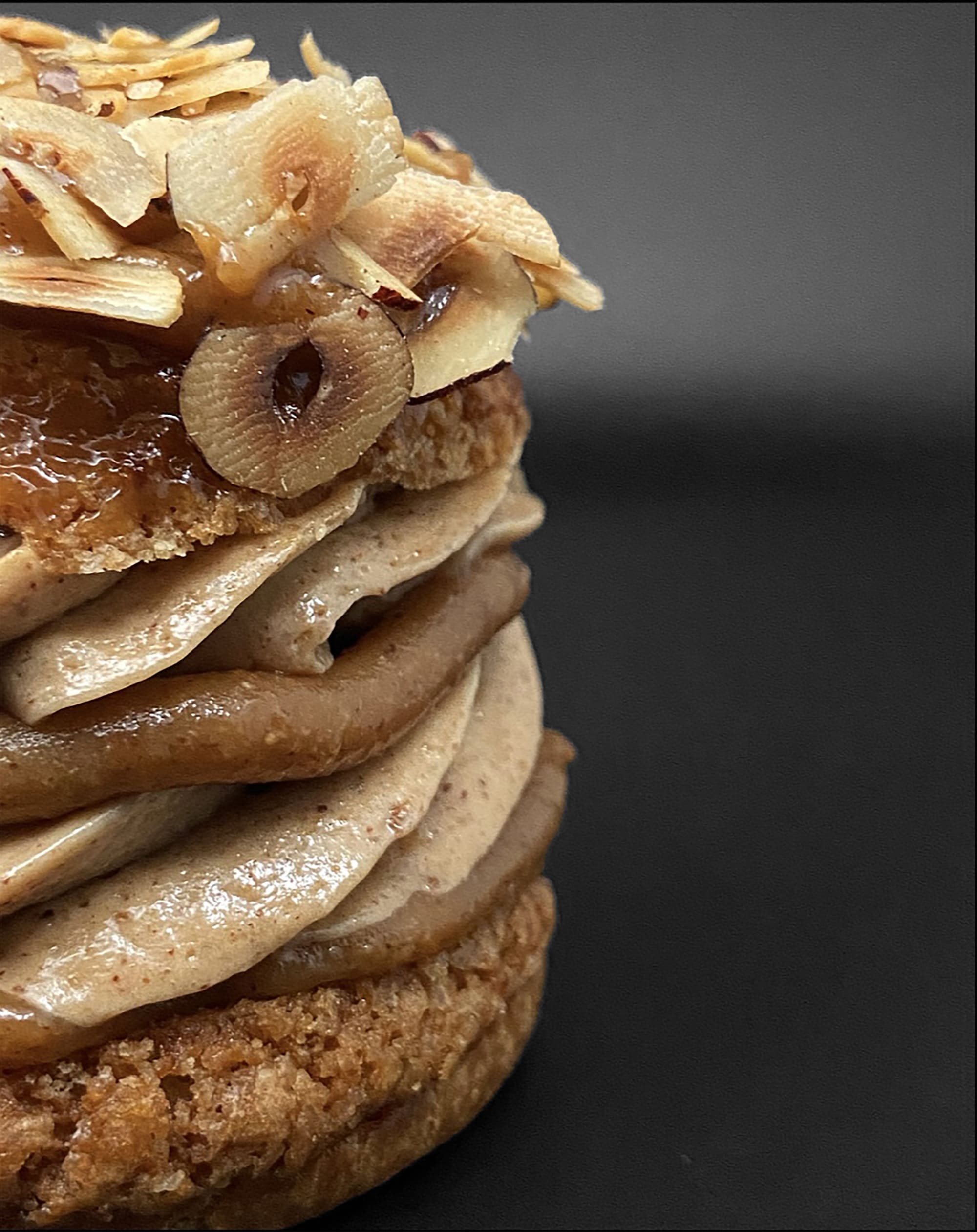 Mousse praliné noisette Crémeux onctueux à la noisette Praliné coulant Pâte à choux et noisettes effilées torréfiées